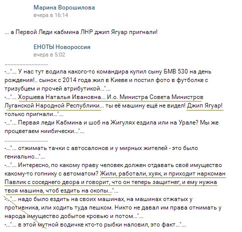 "... Хоршева Наталья Ивановна... И.о. Министра Совета Министров Луганской Народной Республики... ты ее машину еще не видел! Джип Ягуар! только пригнали... Первая леди Кабмина и шоб на Жигулях ездила или на Урале? Мы же процветаем ниибически...", - указано в сообщении.