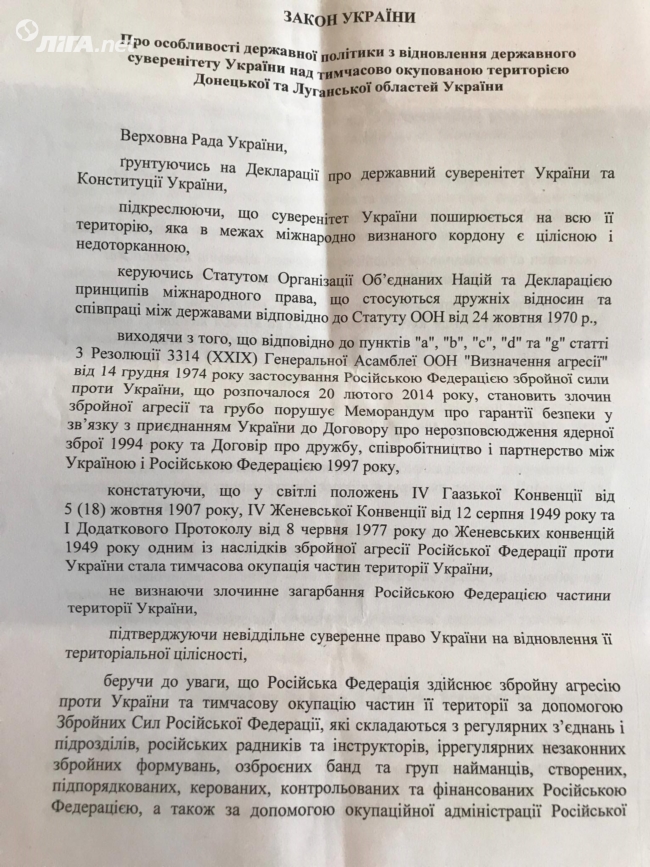 Кратко суть законопроекта можно описать так: поскольку Россия постоянно нарушает взятые на себя обязательства, Украина больше не может продолжать сохранять статус-кво в вопросе оккупированных территорий. Чтобы юридически иметь больше аргументов, Украина утвердит оккупированный статус этих территорий и возложит всю ответственность за них на оккупанта - Российскую Федерацию. "Это усилит наши позиции в суде против России", - говорят собеседники LIGA.net в офисе Петра Порошенко.