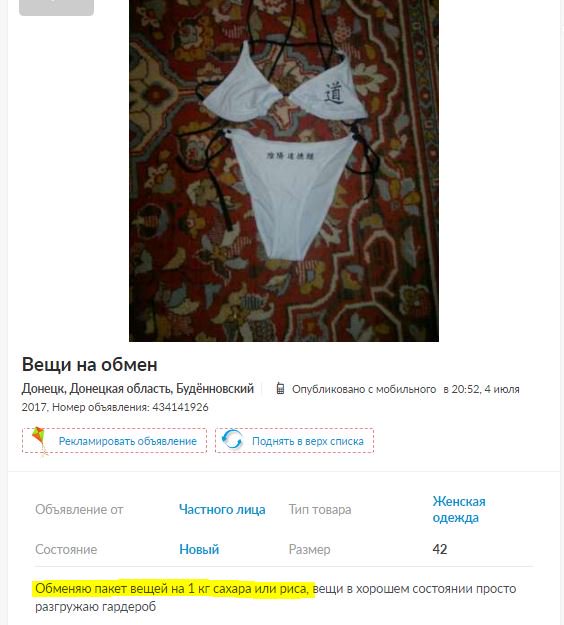 “Обменяю пакет вещей на 1 кг сахара или риса”; “Обмен на продукты питания или ваши предложения”; “Гречка, сахар, масло, кофе, чай, бытовая химия, гигиена”; “Обмен вещей на детское питание”; “На обмен интересуют продукты: сахар, мука, масло, консервы, ваши предложения. Быт. химия любая”, - просят за свой скромный товар дончане.