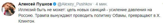 “Цель новых санкций - усиление давления на Россию. Трампа вынуждают проводить политику Обамы, превращают в Х. Клинтон”, - заявил сенатор РФ.