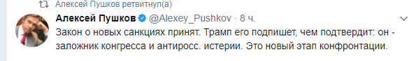 “Закон о новых санкциях принят. Трамп его подпишет, чем подтвердит: он - заложник Конгресса и антиросс. истерии. Это новый этап конфронтации”, - заявил Пушков.