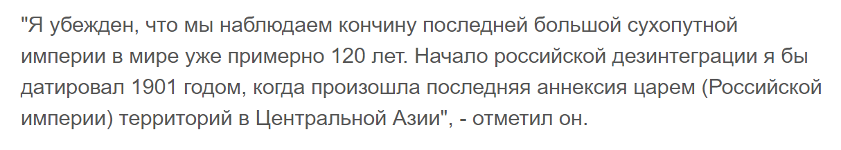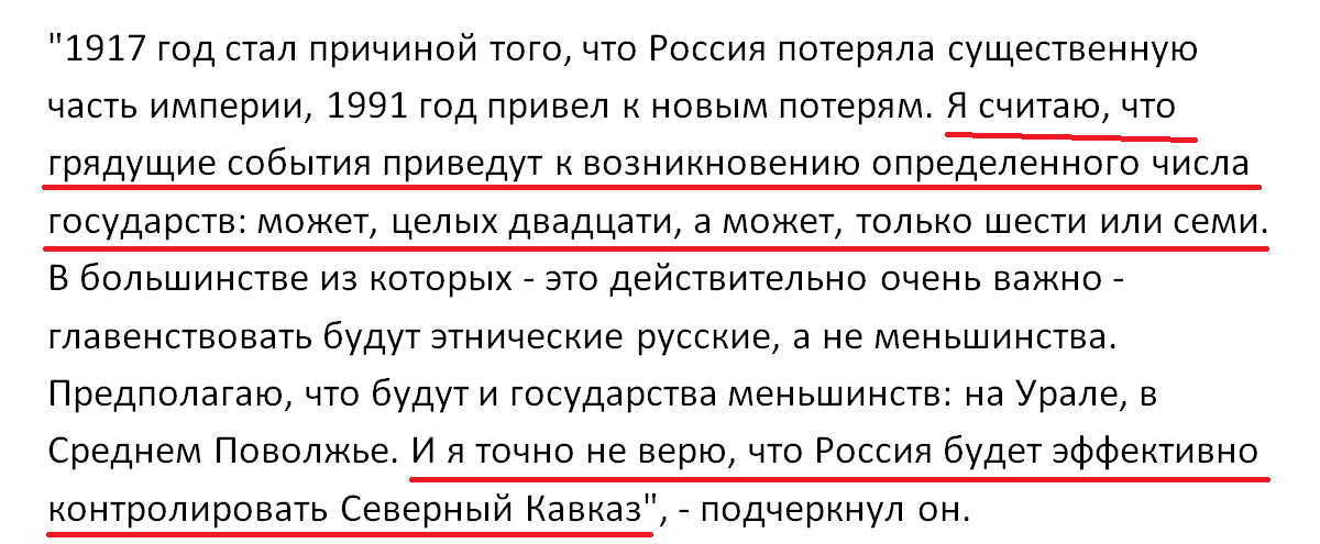 Он отметил, что агония и распад Российской империи уже идет, при этом ближайшие перспективы вызовут распад России на 7-8 отдельных государств.