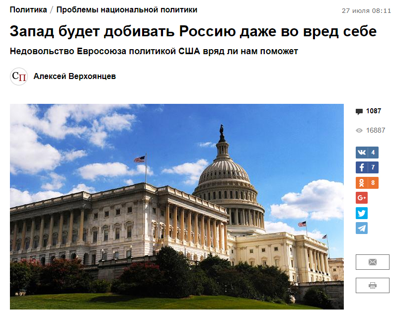 По мнению директора Центра евразийских исследований Владимира Корнилова, в законе об усилении антироссийских санкций, принятом палатой представителей США, важны не сами эти санкции, а единственный их пункт — официальное объявление России врагом.
