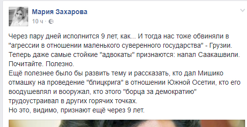 “Через пару дней исполнится 9 лет, как... И тогда нас тоже обвиняли в "агрессии в отношении маленького суверенного государства" - Грузии. Теперь даже самые стойкие "адвокаты" признаются: напал Саакашвили”, - заявила Захарова, забывшая уточнить, кто разжег конфликт и поддержал повстанцев, кто дал оружие и стал за спины сепаратистов.
