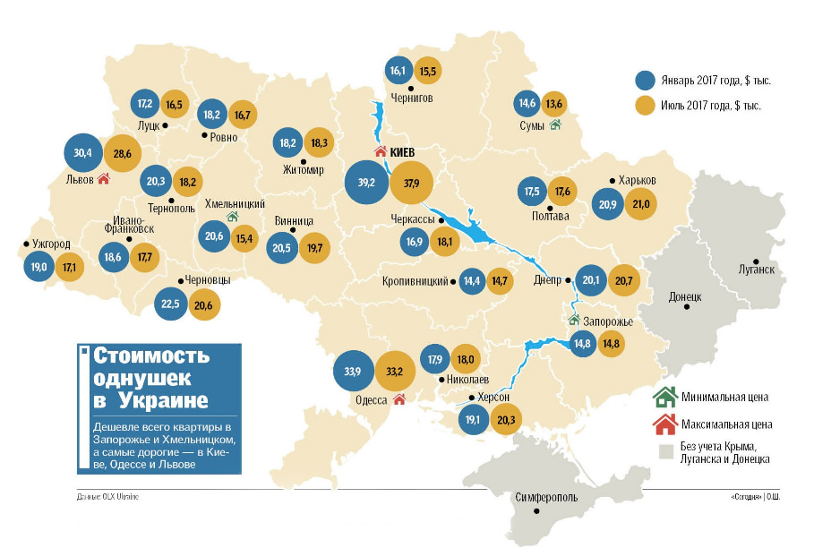 Цены на однокомнатные квартиры на протяжении полугода оставались условно стабильными и в большинстве областных центров снизились к июлю . Больше всего средняя стоимость 1-комнатной упала в Хмельницком — почти на 26%. Также на 10% снизились цены в Тернополе и Ужгороде. А вот в некоторых областных центрах, например в Черкассах, однушки подорожали в среднем на 7%. В целом по итогам полугодия дешевле всего 1-комнатную квартиру можно приобрести в Сумах ($13,6 тыс.), Запорожье ($14,8 тыс.) и Хмельницком ($15,4 тыс). А вот самым дорогим жилье осталось в Киеве, Одессе и Львове. Самыми популярными, как и в прошлые годы, на вторичном рынке остались 2-комнатные квартиры (36% от количества закрытых сделок), на втором месте — 1-комнатные (34%). Замыкают тройку лидеров — 3-комнатные (26%). А вот крупногабаритное жилье с четырьмя комнатами народ традиционно покупал неохотно — их доля в закрытых сделках всего 4%.