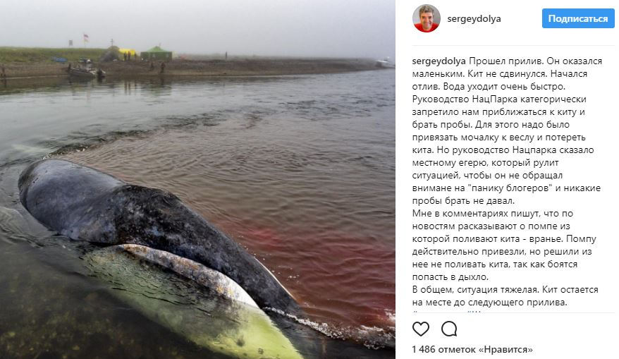 Об истории рассказал один из волонтеров Сергей Доля на своей странице в Instagram. С его слов, китенок попал в ловушку рано утром. "Ночью кит зашел в протоку, на которой мы стоим, и застрял тут во время отлива. Сейчас он лежит на мели. Двигаться не может пока. Уже поранил себя в двух местах. Идет кровь", - рассказал он, отметив, что на место тут же вызвали сотрудников национального парка.
