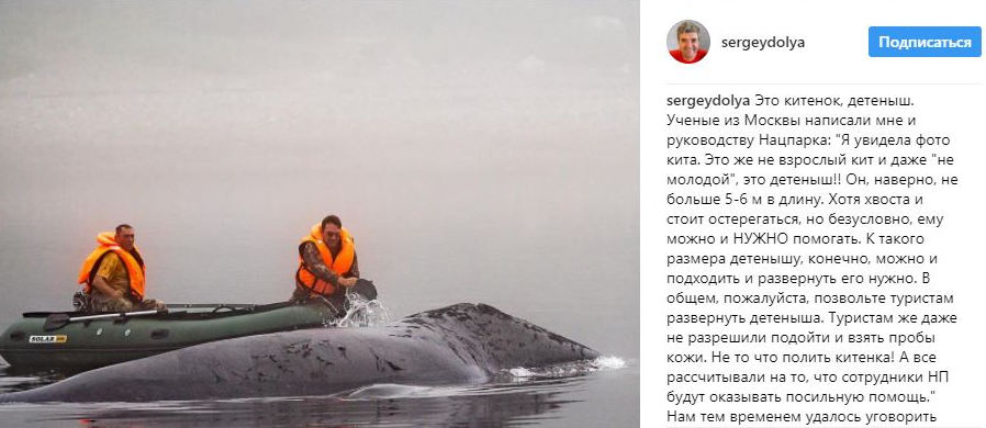 Однако те отказались хоть как-то помочь млекопитающему. "Туристам же даже не разрешили подойти и взять пробы кожи. Не то что полить китенка", - отметил Воля.