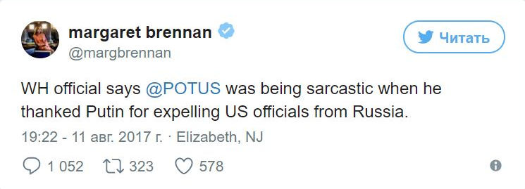 Скандал приобрел такие масштабы, что Белый дом выступил с объяснениями. "Дональд Трамп говорил с сарказмом, когда выражал благодарность Владимиру Путину за сокращение американской дипломатической миссии в России", - уточнила пресс-секретарь Белого дома Сара Сандерс.