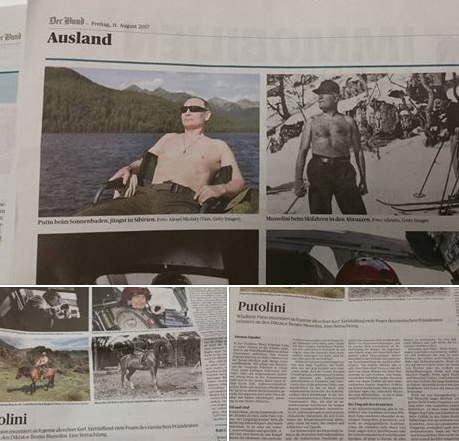В качестве иллюстраций были приведены фотографии обоих диктаторов удивительным образом схожие между собой. Путин и Муссолини с голым торсом, катающиеся на лыжах, плавающие в реке, занимающиеся спортом, стреляющие из личного оружия, ездящие на мотоциклах, сидящие за штурвалом самолета, развлекающиеся с животными, играющие на музыкальных инструментах, осматривающие поля и знакомящиеся с трудом хлеборобов. К фотографиям приложен материал главного редактора международного отдела газеты Tages-Anzeiger Винченцо Каподичи, который анализирует о традиции и нравы "пиара" великих вождей, диктаторов и императоров, от Карла Великого и Муссолини до Мао Дзе Дуна. А далее следует взвод: такие приемы саморекламы ввели в моду национал-социалисты Германии и фашисты Италии.