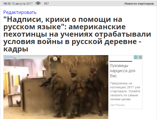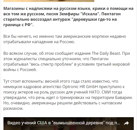 У американских военных теперь новая легенда. Ближневосточная деревня перенеслась в Донбасс – и как будто бы расположена у самых границ с Россией. Журналисты пишут, что Пентагон таким образом готовится, не много не мало, к... третьей мировой. Основной противник – российские военные. Местные жители тоже говорят по-русски. Практически без акцента.
