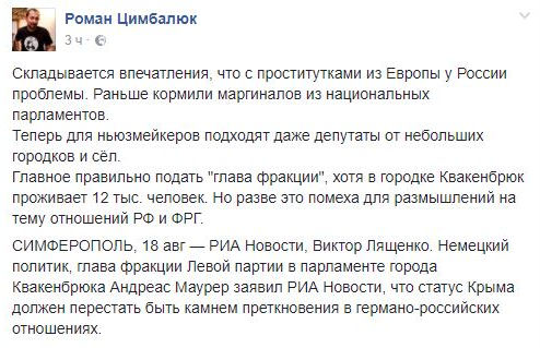 "Складывается впечатления, что с проститутками из Европы у России проблемы", - подчеркнул он, напомнив, что ранее Кремль подкармливал маргиналов из национальных парламентов ЕС, а теперь и те брезгуют иметь с РФ дело.