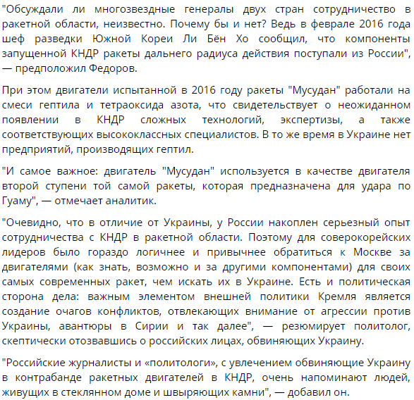 "Про участие Украины в ракетной программе Пхеньяна никаких данных не существует, а вот про долгий период сотрудничества Кремля и КНДР в данном вопросе известно очень много. Все это говорит о том, что двигатели КНДР получила все же из РФ", — говорит Федоров.