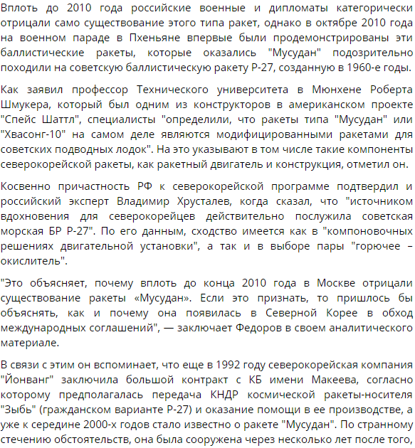 Один из главных аргументов его слов - история с ракетой "Мусудан", которая также имеет название как ВМ-25 или "Хвасонг-10". По словам эксперта, ее появление в Северной Корее нельзя объяснить не чем иным, кроме как помощью со стороны правительства Российской Федерации.