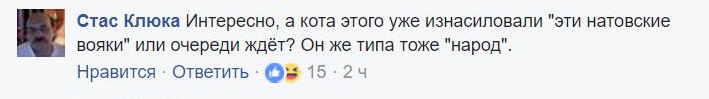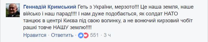Комментируя присутствие войск НАТО на параде в Киеве по случаю Дня Независимости Украины, Кот разразился откровенным бредом. Так, он обвинил Запад в стремлении запугать и уничтожить Украину. "Мы видим, как эти НАТОвские вояки, насилующие и убивающие наш народ, вышагивают по центру Киева. Они делают все, чтобы столкнуть лбами наш народ", - разошелся Кот, призвав выгнать войска НАТО из Украины.