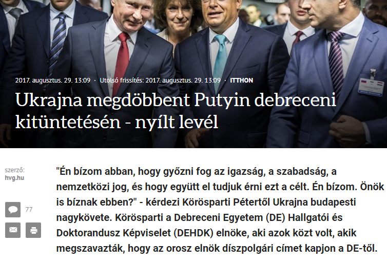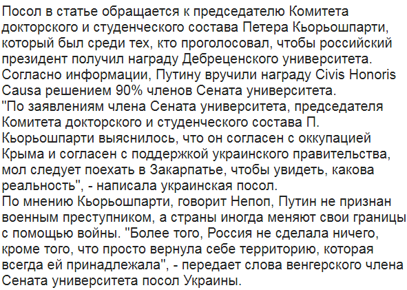 Амбассадор Украины в Венгерской Республике Любовь Непоп обратилась с открытым письмом к Дебреценскому университету Венгрии через вручение награды президенту страны-агрессора - России - Владимиру Путину.