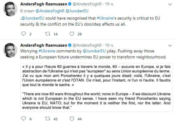 "Комментарии Юнкера вызывают обеспокоенность. Отталкивание тех, кто стремится к европейскому будущему, подрывает силы ЕС менять соседние страны", – написал Расмуссен.