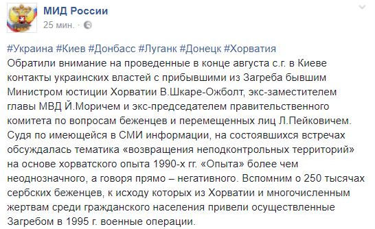 Они отметили, что в конце августа украинцы пообщались с министром юстиции Шкаре-Ожболтом, экс-заместителем главы МВД Моричем и другими высокопоставленными лицами Хорватии. "Обсуждалась тематика "возвращения неподконтрольных территорий" на основе хорватского опыта 1990-х гг", - заявили россияне, добавив, что этот опыт по деоккупации якобы был негативным.