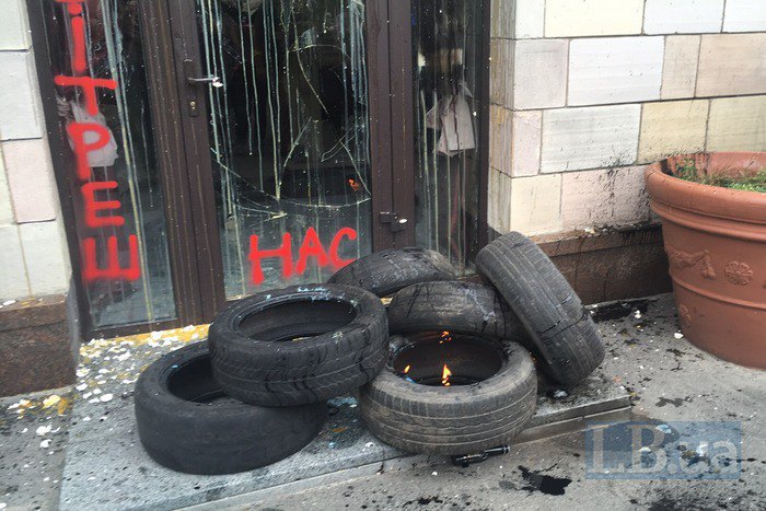 Кроме того, перед входом в магазин, митингующие жгли покрышки.