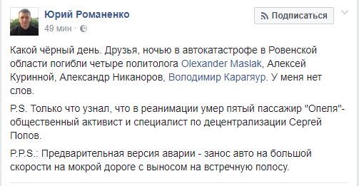 Сегодня утром при столкновении иномарки Opel Omega и грузовика DAF погибли украинские политологи Александр Маслак, Алексей Куринной, Александр Никаноров, Владимир Карагяур и Сергей Попов.