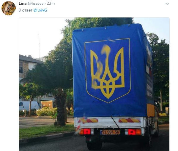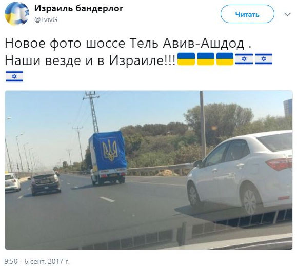 "Израильский бандерлог", с его слов, заприметил патриотический грузовик на трассе Тель-Авив - Ашдод. Подписчики в ответ начали делиться своими фотографиями заметного автомобиля. "Владелец машины живет где-то в Бат-Ям. Машина там постоянно по вечерам припаркована, мне уже сын много раз фото присылал", - отметил один из пользователей.