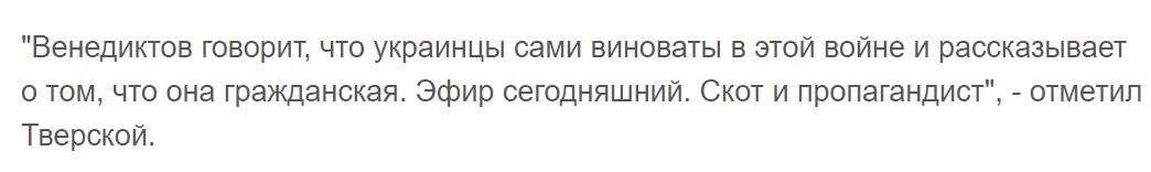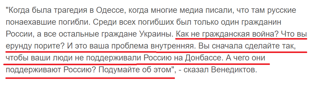 Так Венедиктов отметил, что в Одессе во время пожара 2014 года погибли в основном украинцы, заявив, что это основной признак "гражданского конфликта". Он также задался вопросом, почему жители Донбасса поддерживают Россию, отметив и огромное количество людей, которые вышли на площадь Донецка во время похорон террориста "Моторолы".