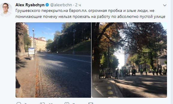 В соцсетях киевляне публикуют фото пустых улиц в центре города и заявляют, что недовольный перекрытием дорог.