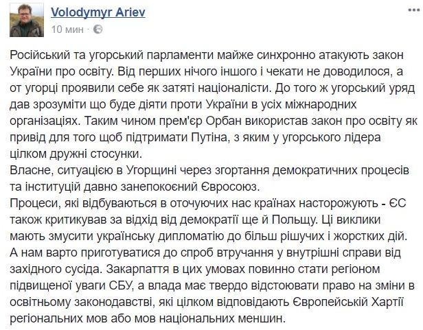"Российский и венгерский парламенты почти синхронно атакуют закон Украины об образовании. К тому же венгерское правительство дало понять, что будет действовать против Украины во всех международных организациях", - напомнил народный избранник, уточнив, что венгры внезапно повели себя как ярые националисты.