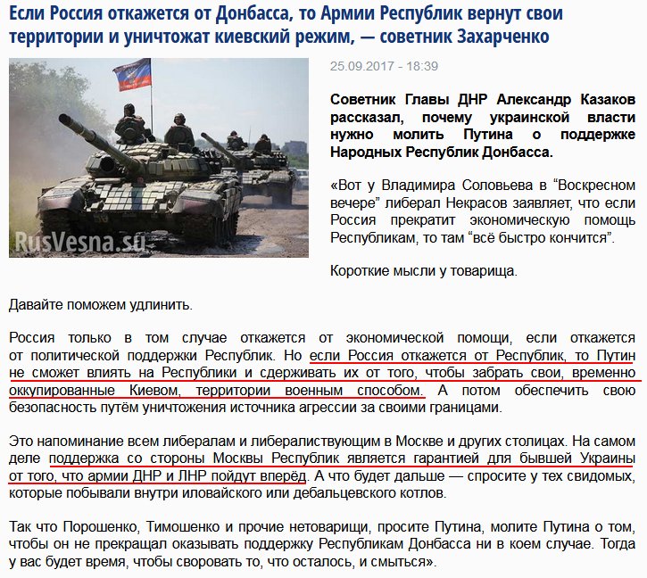 Советник главы "ДНР" Захарченко Александр Казаков заявил, что Украина "должна молить Путина" о поддержке так называемых "республик" Донбасса, так как в случае отказа от сдерживания армия "ДНР" пойдет вперед и "уничтожит киевский режим", вернув себе свои территории.