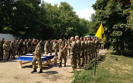 Бойцы батальона «Азов» выстроились в один ряд, чтобы попрощаться со своим погибшим товарищем. Его бледный труп лежал под солнцем в открытом гробу, отороченном голубым бархатом.