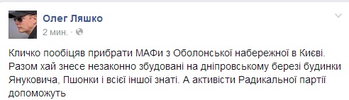 "Кличко пообещал убрать МАФы с Оболоньской набережной в Киеве. Вместе пусть снесет незаконно построенные на днепровском берегу дома Януковича, Пшонки и всей другой знати. А активисты "Радикальной партии" помогут", - написал он у себя на странице в Facebook.