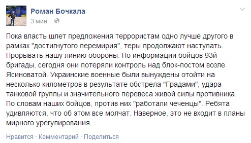 "По информации бойцов 93й бригады, сегодня они потеряли контроль над блок-постом возле Ясиноватой. Украинские военные были вынуждены отойти на несколько километров в результате обстрела "Градами", удара танковой группы и значительного перевеса живой силы противника. По словам наших бойцов, против них "работали чеченцы". Ребята удивляются, что об этом все молчат. Наверное, это не входит в планы мирного урегулирования...", - написал журналист Роман Бочкала на своей странице в Facebook.