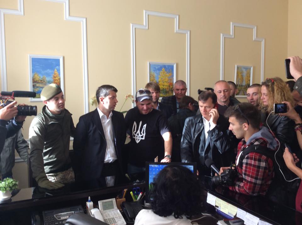 "Пытаемся найти губернатора, регионала и титушковода Кузьменко. Он прячется, как крыса. Громада города начала люстрацию в Кировоградской ОГА. Народ понес на мусорник руководителя аппарата ОГА Смаглюка", - написал Мосийчук, опубликовав фото.