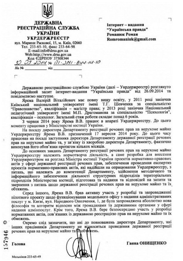 "С июня 2014 года Ярема В. В. работает в аппарате Укргосреестра. До этого момента работал в Министерстве юстиции. На должность директора Департамента регистрации имущественных прав на недвижимое имущество Ярема В. В. назначен 17 сентября 2014", - говорится в документе.