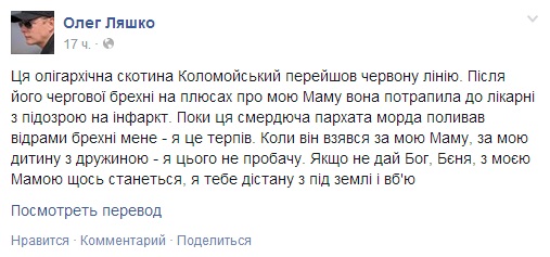 "Когда он взялся за мою маму, за мою жену и ребенка - я этого не прощу. Если не дай Бог, Беня, с моей мамой что-то случится, я тебя достану из-под земли и убью", - написал Ляшко.