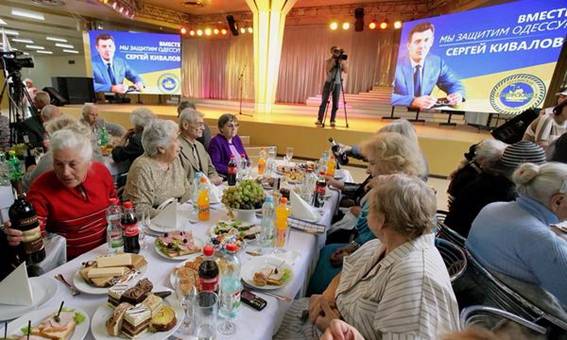 В Одессе пригласили пенсионеров и врачей на встречу с кандидатом в народные депутаты Сергеем Киваловым, где раздавали продуктовые наборы («Морская партия») и «материальную помощь» в размере 200 гривен.