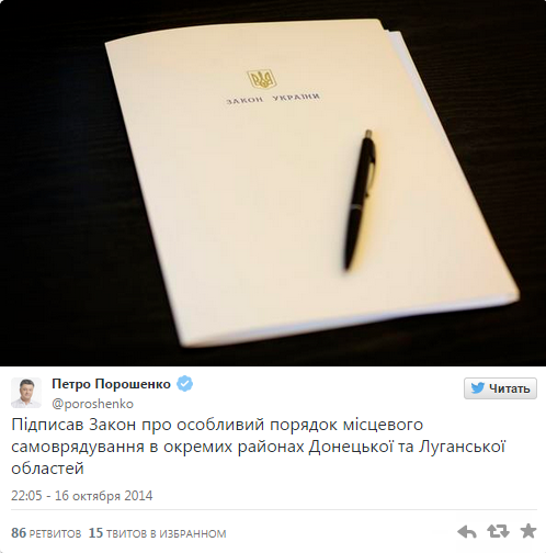 Отметим, ранее спикер Верховной Рады Александр Турчинов подписал закон "Об особом порядке местного самоуправления в отдельных районах Донецкой и Луганской областей". Сделал это он сегодня, 14 октября. После этого Турчинов отправил документ на подпись президенту.