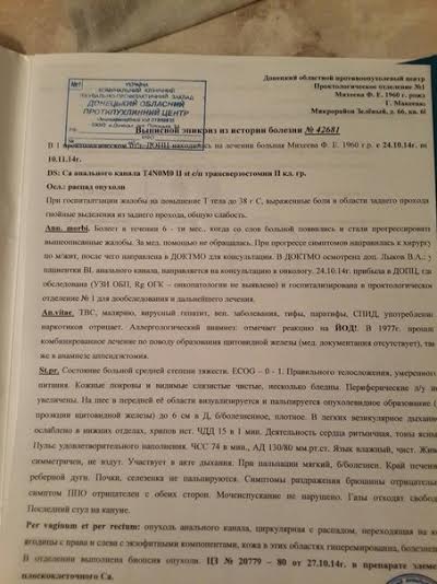 Благодаря Вашей помощи нам 27.10 сделали операцию по выведению стомы в онкологической больнице г Донецка. 29.10 пришли ответы на гистологию, РАК подтвердили! Врачи говорят, что данный вид рака можно лечить, но нужны деньги ( около 7 тыс на лучевую терапию и 2 операцию по удалению опухоли - около 10 тыс.) Мы одни и потерять ее я просто не могу, отец погиб 15 лет назад, на данный момент я нахожусь уже на 38 неделе беременности (одиночка)... из за обстоятельств (с мая месяца без зп и работы)!