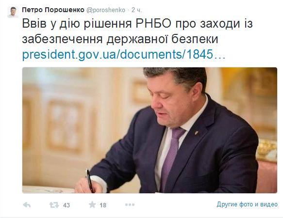 Об этом сообщил Порошенко в Твиттере, а позже соответствующее заявление было размещено на сайте главы государства.