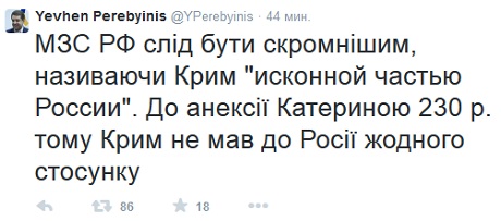 "МИД РФ следует быть скромнее, называя Крым "исконной частью России". До аннексии Екатериной 230 лет назад Крым не имел к России никакого отношения", - написал на своей странице в твиттере Перебейнос.