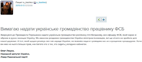 Ляшко потребовал от Порошенко дать гражданство Украины экс-офицеру ФСБ
