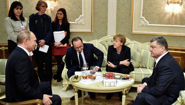 Лидеры также отметили общее согласие двигаться вперед для реализации последующих шагов, предусмотренных пакетом мер, принятых в Минске 12 февраля, в частности отвод тяжелых вооружений, продолжение контроля за соблюдением перемирия и началом диалога о проведении местных выборов в соответствии с украинским законодательством.