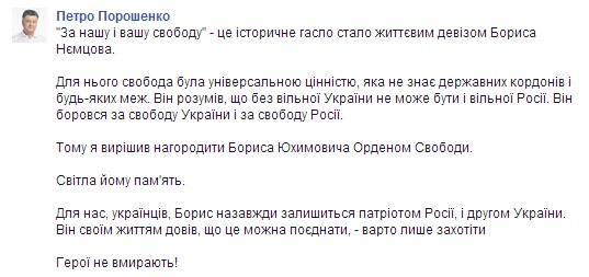 Герои не умирают!", - говорится в сообщении Петра Порошенко в Facebook.