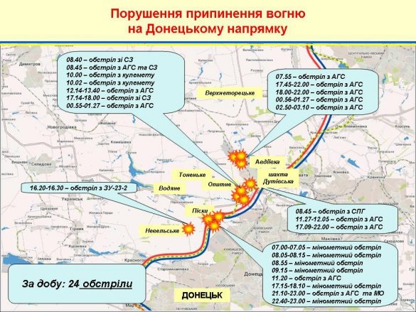 Так, согласно одной из них, на донецком направлении за сутки сепаратисты 24 раза обстреляли военнослужащих. Обстрелы зафиксированы в районе населенных пунктов Авдеевка, Опытное, Пески, Новосельское и др.