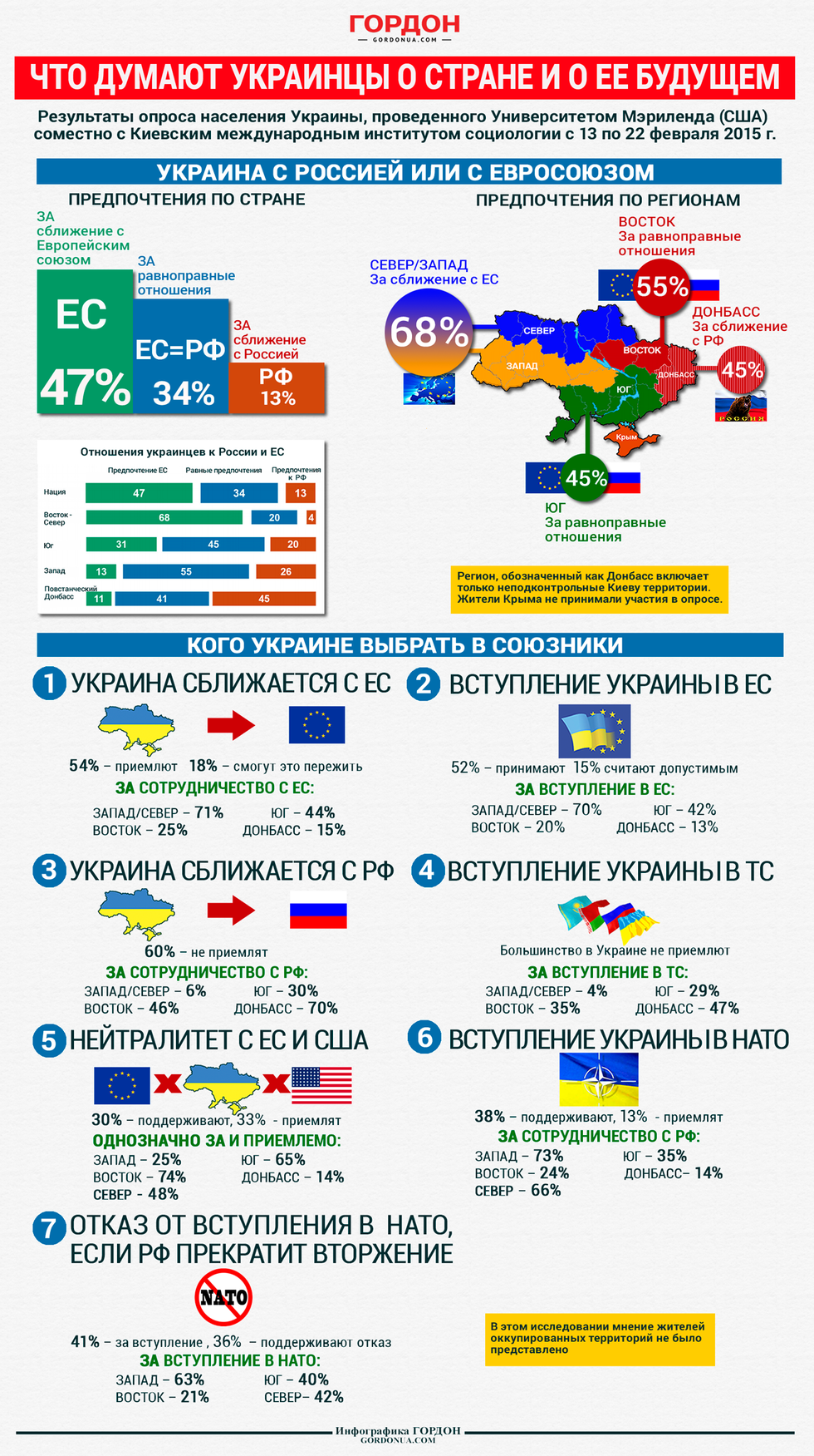"ГОРДОН" представляет сборную инфографику по результатам опроса жителей Украины, проведенного Университетом Мэриленда в сотрудничестве с Киевским международным институтом социологии.
