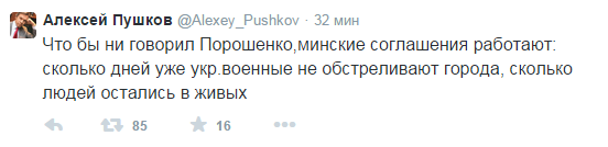 "Что бы ни говорил Порошенко, минские соглашения работают, сколько дней уже украинские военные не обстреливают города, сколько людей остались в живых", - написал Пушков.