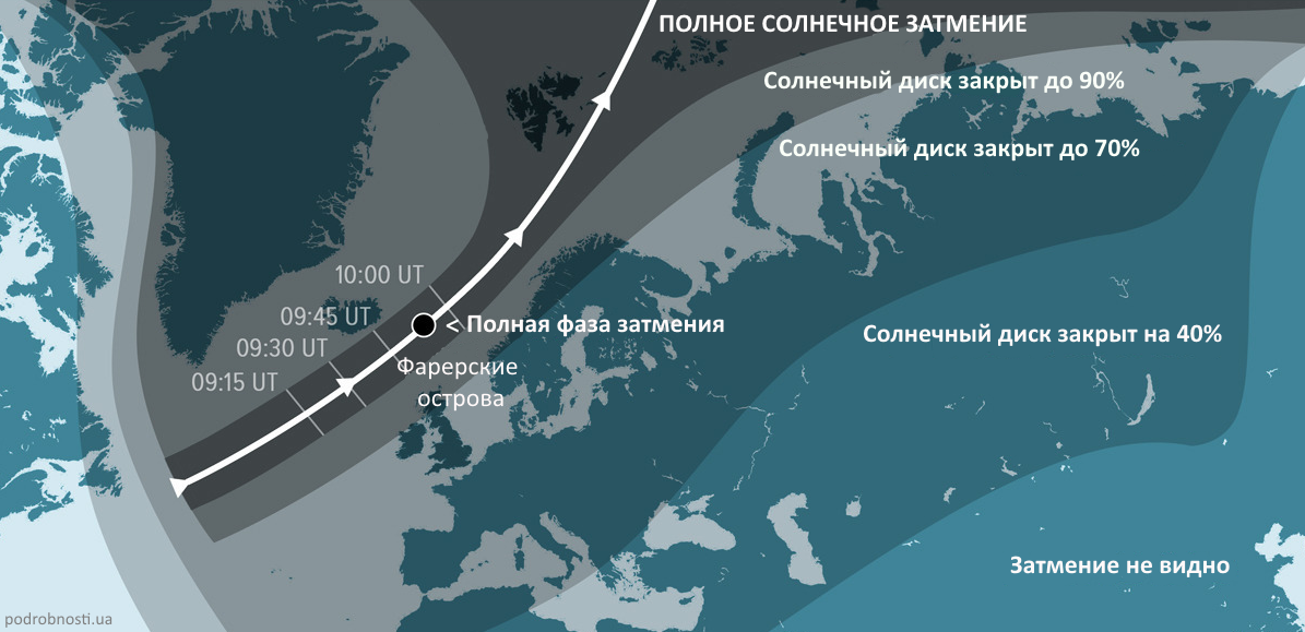 Это затмение является крупнейшим за 16 лет. Единственные места для наблюдения полной фазы затмения на суше - это Фарерские острова Шпицберген.