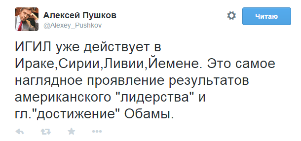 "ИГИЛ уже действует в Ираке, Сирии, Ливии, Йемене. Это самое наглядное проявление результатов американского "лидерства" и главное "достижение" Обамы", — написал Пушков у себя в Твиттере.