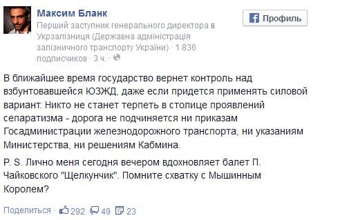 "В ближайшее время государство вернет контроль над взбунтовавшейся ЮЗЖД, даже если придется применять силовой вариант. Никто не станет терпеть в столице проявлений сепаратизма - дорога не подчиняется ни приказам Госадминистрации железнодорожного транспорта, ни указаниям Министерства, ни решениям Кабмина. P. S. Лично меня сегодня вечером вдохновляет балет П. Чайковского "Щелкунчик". Помните схватку с Мышинным Королем?", - написал Бланк.