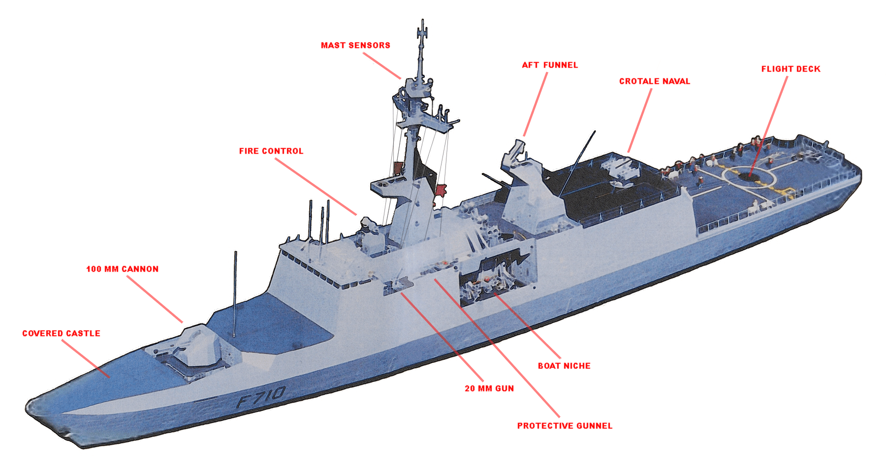 Если говорить о самом проекте, то он был разработан фирмой DCN International. Фрегаты проектировались в соответствии с программой развития Вооруженных сил Франции в период с 1987 по 1991 годы. Программа предусматривала строительство десяти фрегатов этого типа, но из-за финансовых трудностей серию сократили сначала до восьми, а затем и до пяти кораблей. В состав Французского флота входят следующие корабли этого класса: La Fayette (бортовой номер F710), Surcoef (F711), Courbet (Курбе) (F712), Aconit (F713) и Guepratte (F714). Первый корабль серии - Лафайет, была введен в строй в 1996 году, а последний, Guepratte - в ноябре 2001 года.