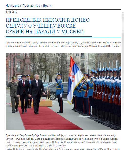 Президент Сербии Томислав Николич принял решение об участии сербской армии в "Параде победителей" по случаю Дня Победы на Красной площади в Москве 9 мая 2015, сообщает официальный сайт главы государства.